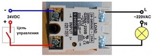 In the classic version, two contacts of a switched circuit and two control wires are included in the device case. Their number can change with an increase in the number of connected phases. Depending on the presence of voltage in the control circuit, the main load is turned on or off by the semiconductor elements.