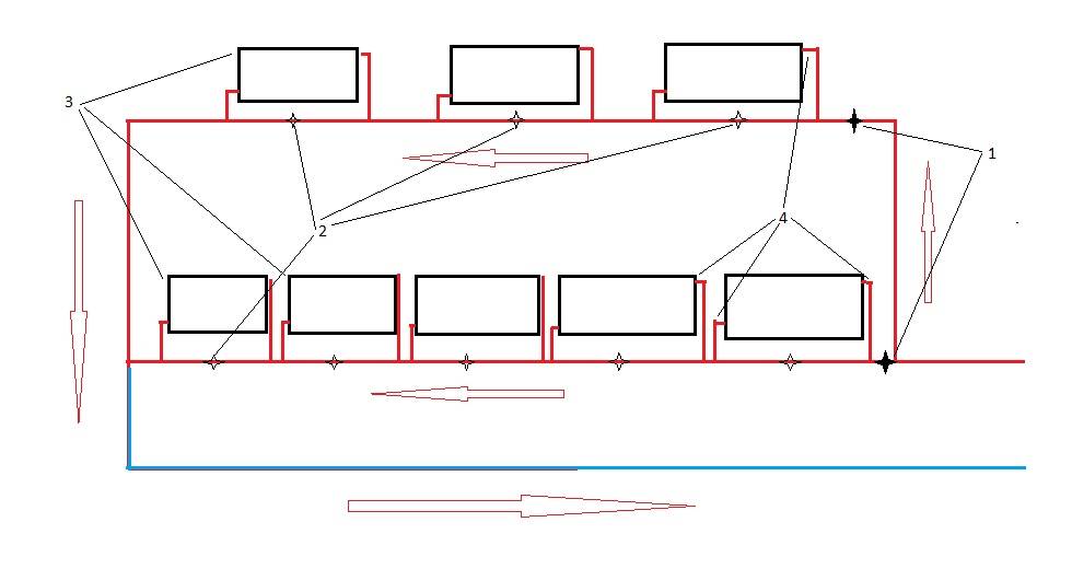 The first option is graphically illustrated in Scheme 1. The main disadvantage is strong cooling along the large ring. The first radiators will be the hottest and the farther the colder: