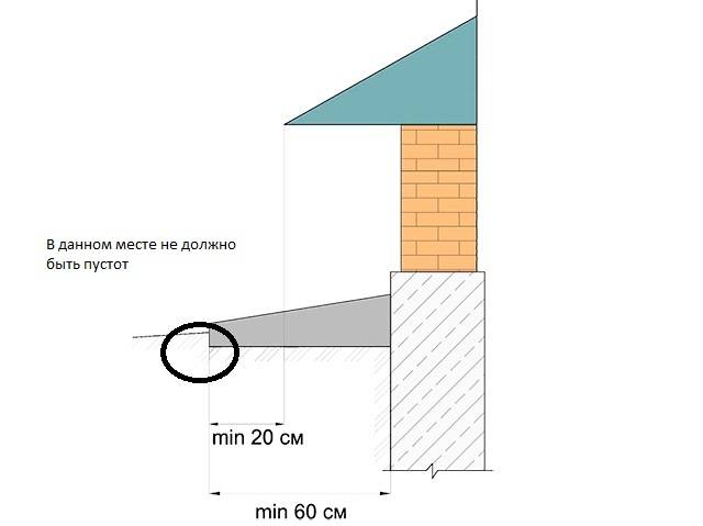 1. First you need to check the blind area around the perimeter of the house for its integrity and for subsidence of soil along its edge. If you find a subsidence of the soil, then rainwater comes to the foundation and leads to increased humidity. The painful spot is circled in the figure. Moreover, the fungus is on the ceiling, and not on the walls or floor level.