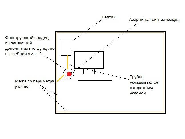 2. Discharge of treated effluents into a filtering well of large volume, and from it into the well made along the perimeter of the site. Part will go into the ground, when overflow is pumped into a mini-groove. Put a drain pump in the filter well, which will turn on when overflowing. The boundary here is a ditch 20 cm wide and deep. For its arrangement, you do not need any permissions, including from your neighbors. Provide a convenient installation of a filter well in advance. In the case of a full tank and boundary, you can call the scavengers for complete pumping.