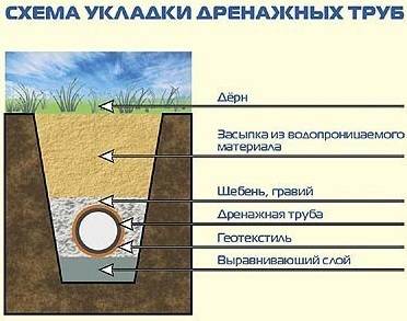 2. At the bottom of the dug trench with an appropriate slope, a sand cushion 2-4 cm thick is arranged. Then the geotextile is spread and crushed stone is poured with a fraction of 20-40 mm., The layer thickness is about 10 cm. And only then a drainage pipe is laid, which is sprinkled with crushed stone with each side in the same layer. After it is covered with geotextile overlapping and covered with clean sand. Sand is used in the pillow and backfill as an additional filter. In combination with geotextile, the risk of siltation and clogging of the drainage holes of the pipe is minimized. Crushed stone creates the necessary rigidity to keep the pipe intact. Figure 1 shows a sectional view.