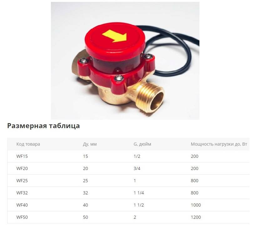 The diameter of the piping pipes is not indicated by you, but I will not focus on the pump. Therefore, I think you should choose a flow switch from the WF-15 ~ 50 series. The numbers after the series designation are Øcondition. Intermediate values are 20, 25, 32, 40. The power range of electric motors that the relay can turn off is 200 ~ 1200 watts. The maximum temperature of the heat carrier is 110 degrees. Screenshots: appearance and characteristics, as well as the WF connection diagram - attached.