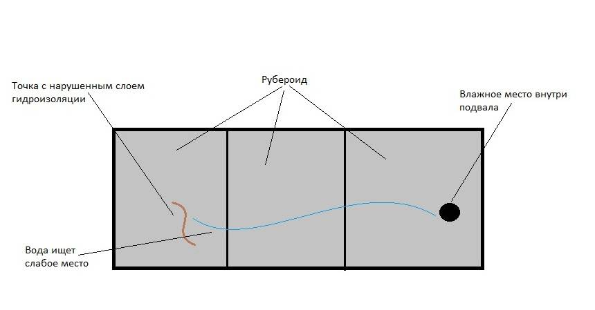 If the waterproofing was carried out by roll material (roofing material), the integrity may be violated at any point on the foundation. The place of the wet wall surface in the basement does not mean that the integrity of the waterproofing is violated in this very place on the reverse side. For clarity, Figure 2. Most likely, it will be necessary to excavate almost the entire perimeter. If the waterproofing is made with bituminous mastic or liquid rubber, the integrity is violated strictly at the same point from the back.
