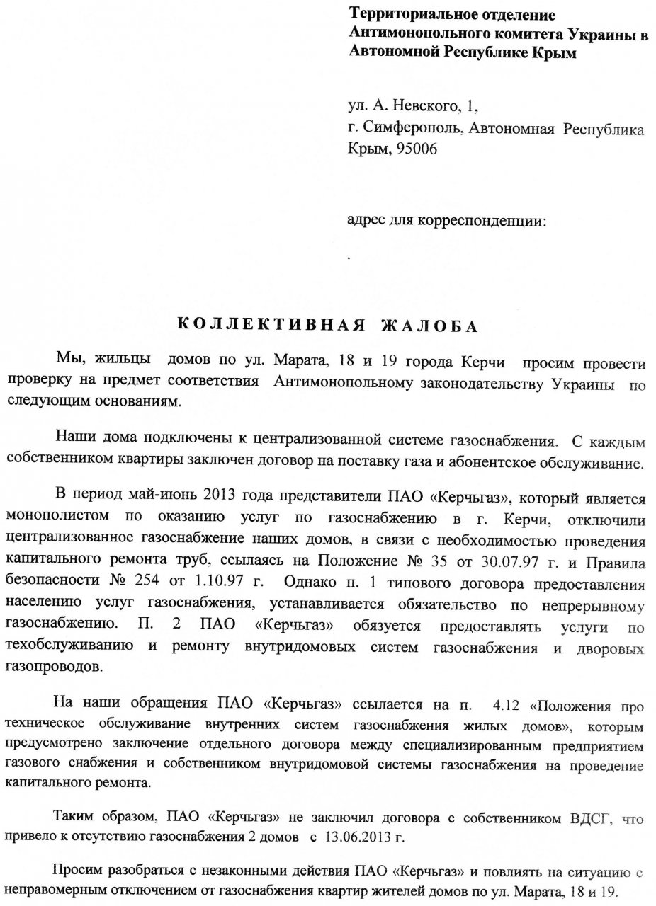 The complaint against GorGaz is made in Russian, regardless of the native language of the applicant. Existing laws and regulations do not regulate the exact sample claims. The document should contain the main causes of the conflict and the individual circumstances of the situation, however it can be written in free form.