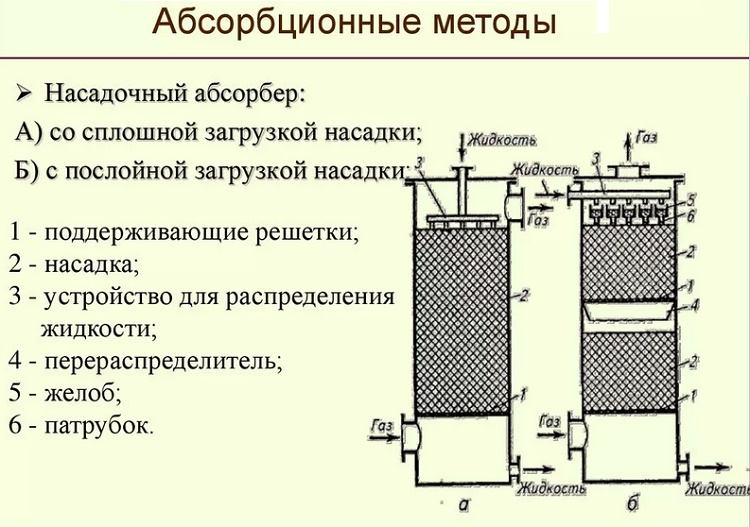 The absorption technology is characterized in that gaseous hydrogen sulfide impurities are dissolved in the active liquid substance. As a result, gaseous contaminants pass into the liquid phase. Then the selected harmful components are removed by evaporation, otherwise desorption, by this method they are removed from the reactive liquid.