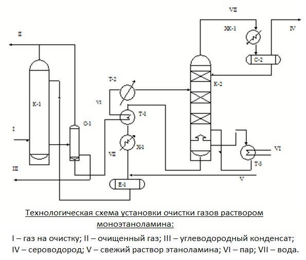 Maximum absorbency with respect to H2S is characterized by a solution of monoethanolamine. However, this reagent has a couple of significant disadvantages. It is characterized by rather high pressure and the ability to create irreversible compounds with carbon monoxide during the operation of the amine gas purification unit.