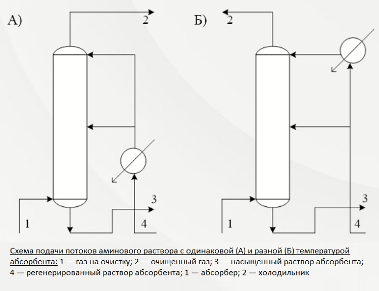 Fourth way. This technology determines the supply of an aqueous solution of amine in two streams with different degrees of regeneration. That is, one is supplied unrefined, containing hydrogen sulfide inclusions, the second without them.
