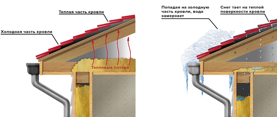 During the day, the melted water escapes to the edges of the roof and into the gutters. At night, it freezes, which leads to the gradual destruction of the elements of the roof and gutters.