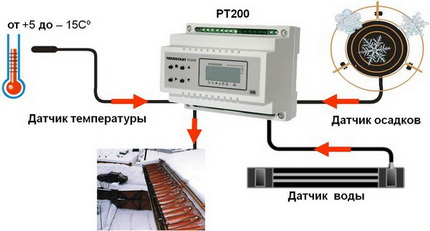For example, a place on the roof of a house is selected for a snow sensor, and a water detector is selected at the bottom point of the gutter. All work is carried out according to the manufacturer's instructions. We connect the detectors to the controller. If the building is large, the sensors can be combined into groups, which are subsequently connected in turn to a common controller.