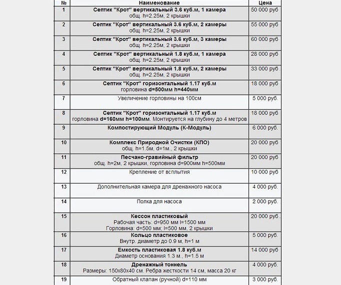 In addition, the design does not provide for a separate storage tank for purified water, therefore, when installing the Krot septic tank, an absorption well or a filtration field is created without fail to purify and remove water to the ground.