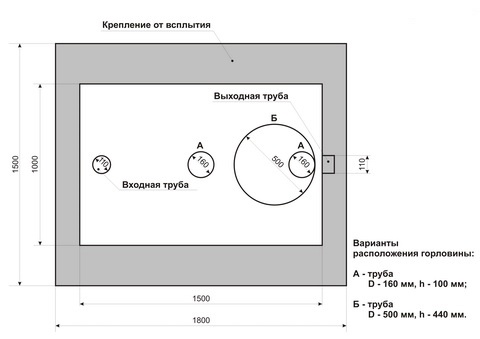 In the standard version, the neck of the septic tank has a diameter of 50 cm and a height of 44 cm, but at the request of the customer these parameters can be changed. In addition to the main lid, the tank is equipped with an additional lid made of foamed polyethylene.