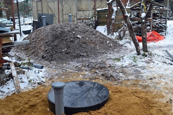 Now you need to sprinkle the device with sand.It is not necessary to add cement and other binders to the sand. First, the container is filled with water to compensate for external pressure. Then fill the free spaces around the body with sand. After filling, the water is removed from the tank, the septic tank is closed with a lid and its operation is checked.