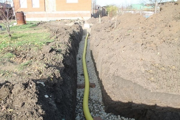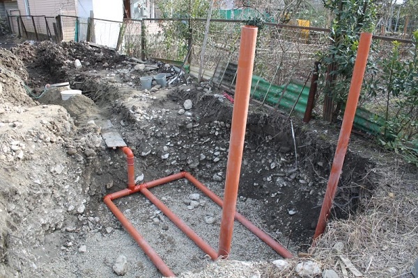 At a depth below the freezing point of the soil, which is about 90 cm, a sewer pipe is fed in, not forgetting to maintain an inclination angle of 3%. A sewer pipe with a pipe is connected by means of a two-way coupling.