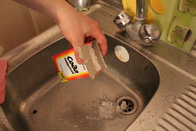 First of all, remove water from the sink - excess fluid will reduce the effectiveness of the product. Pour 50 g of soda ash and baking soda into the sink. After 30 minutes, pour 150 ml of vinegar and 150 ml of chlorine there.
