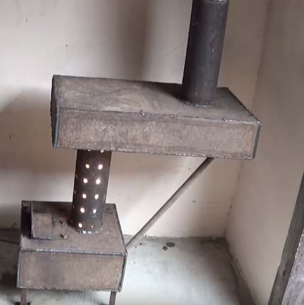 A rectangular partition of 7 * 33 cm is cut out of thick steel and welded onto a circle, shifting closer to the nozzle. The exhaust pipe itself is made of a 13-centimeter section of the chimney.