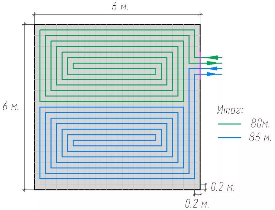 The volume of the warm floor is calculated by the meter of installed pipes.