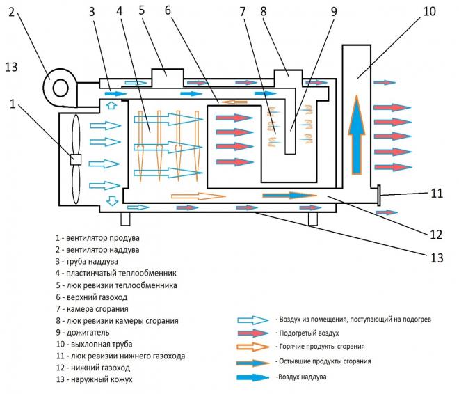After heating, the latter leave the heat-exchange chamber through a special opening equipped in the housing, while the combustion products leave the gun through the side pipe, which is connected to the chimney pipe.