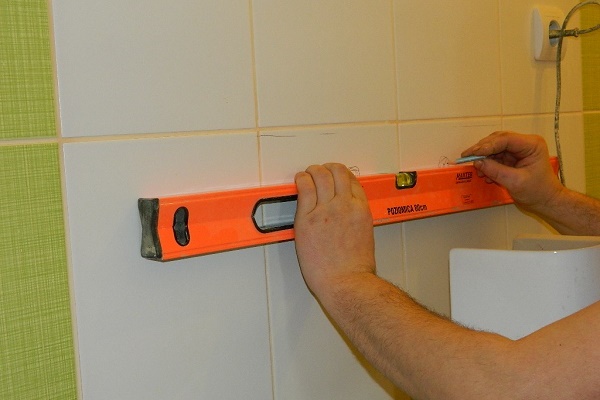 To determine the location of the fasteners, we put a support column, on which we put the bowl without fixing it. It is important to align the structure with a level, and then use a pencil or marker to mark places on the wall for attaching the sink.