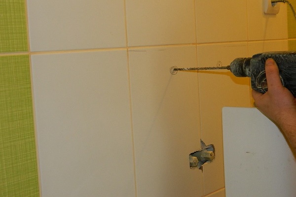 Using marks with an electric drill, we drill holes whose diameter and depth correspond to dowels prepared in advance. If the wall is finished with ceramic tiles, drilling must be carried out very carefully using a special drill.