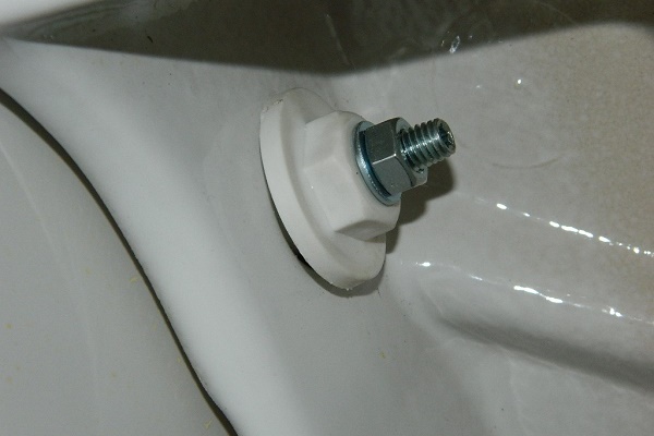 We hang the washbasin bowl, and bait the nuts through plastic or rubber gaskets.