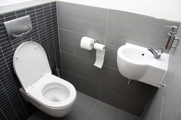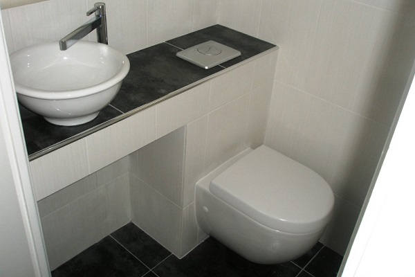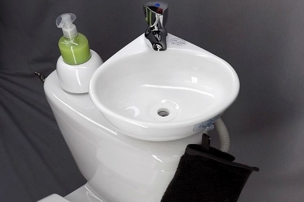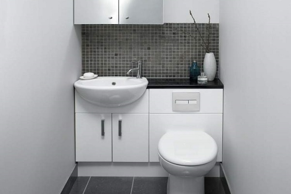The washstand above the drain tank will not occupy the useful area and will help in arranging a tiny room.