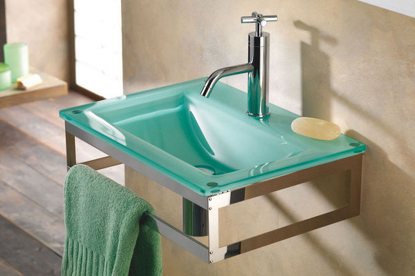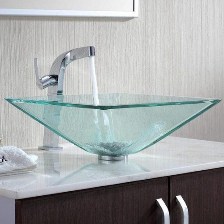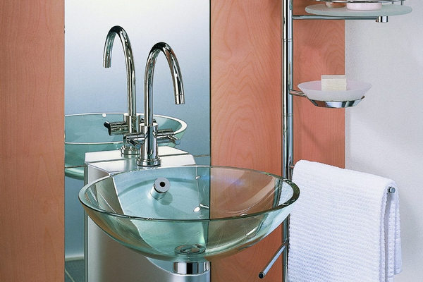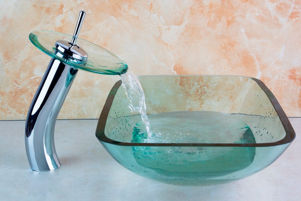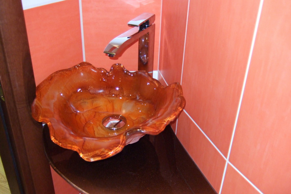 Catchy, stylish and original will look glass sinkbut will require constant care. Otherwise, ugly marks from water droplets will settle on the surface and the model will lose aesthetics and attractiveness.