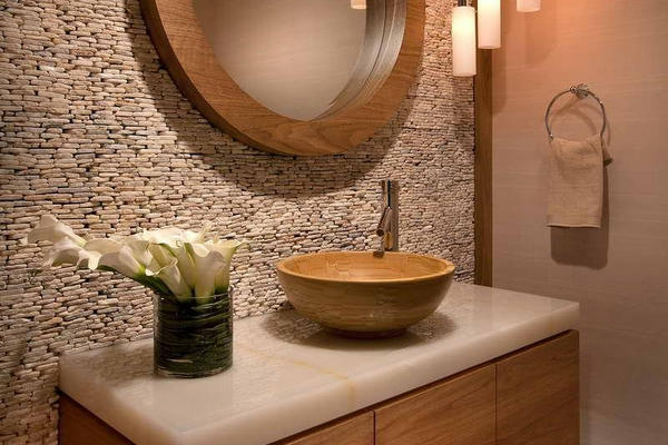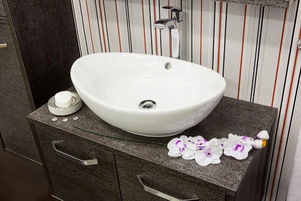 For arrangement of a cozy, calm atmosphere in a sanitary-hygienic room, it is worth using overhead bowls. They are not built into the countertop, but mounted on top, giving the environment an elegant retro style.