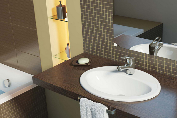 For recessed sinks First you need to make a cutout in the corresponding shape in the countertop, or initially purchase a factory kit from the washstand and cabinet.