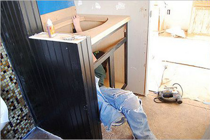 Here you can appreciate the work of professionals who install a custom-made hanging design with an overhead washbasin: