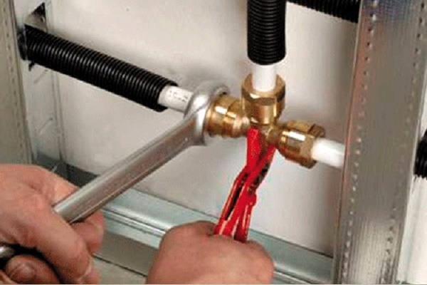 Assembling a water pipe from metal-plastic pipes performed by a master plumber: