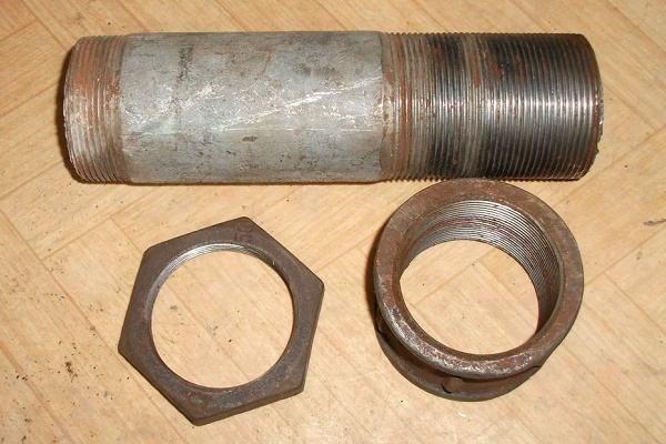 - A lock nut is screwed onto the pipe section with a long thread. It is necessary for fixing the coupling.