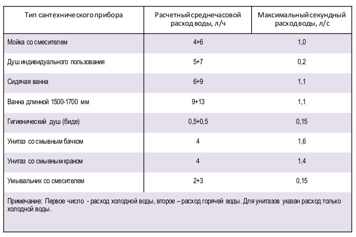 It is possible to establish the standard water consumption for a certain sanitary equipment either from its data sheet, or, in a generalized format, according to SP 30.13330.2012 (Appendix A1).