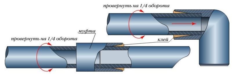 An important nuance: when gluing parts you need to work very clearly. A piece of pipe is inserted into the fitting in one motion. It should not be sharp, but fast. When the pipe is inserted, it must not be rocked or twisted so as not to reduce the strength of the connection.