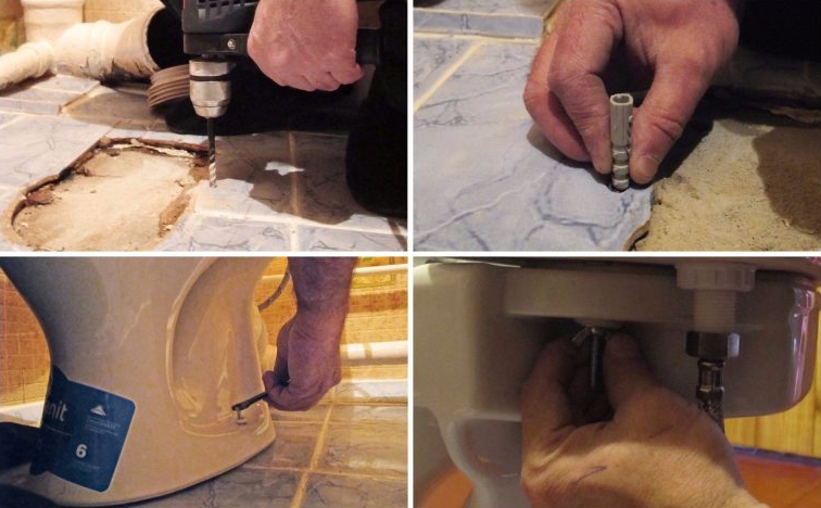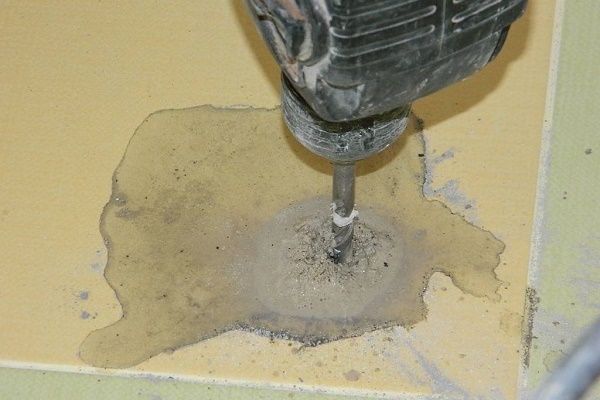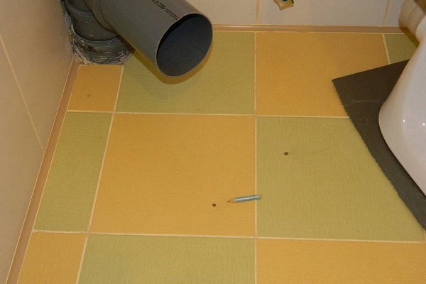 - Put the plumbing aside.All necessary marks remained on the floor. Take a drill with a 12th drill and drill holes in the tile. It is better to beat concrete with a perforator with a No. 12 drill. Insert the dowels into the holes.