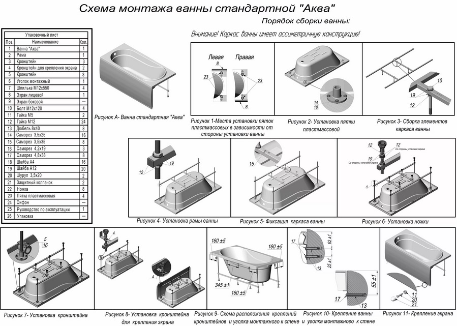 Acrylic bathtubs are often equipped with a metal frame. There are adjustable legs with which you can easily select the height of the polymer bowl. The attached set includes multi-dimensional metal profiles, where there are already mounting holes, 4 legs, 4 racks in the form of studs, 4 thrust bearings, 16 nuts, and self-tapping screws.