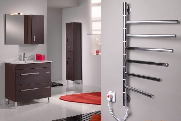 The result of one of these ideas was heated towel rail. It does not require installation at all, to turn it on, just plug the device cord into a power outlet. This option is suitable for bathrooms with a large area and a permanent dry floor area, where the device can fit without interference.