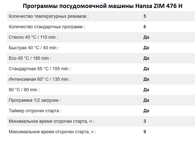 Hansa ZIM 476 H is a decent model for a small family with a modest-sized kitchen. With proper use, it launders dishes well, while operating costs will be minimal. If the Hans dishwasher is installed and used correctly, it will last several years without breakdowns.