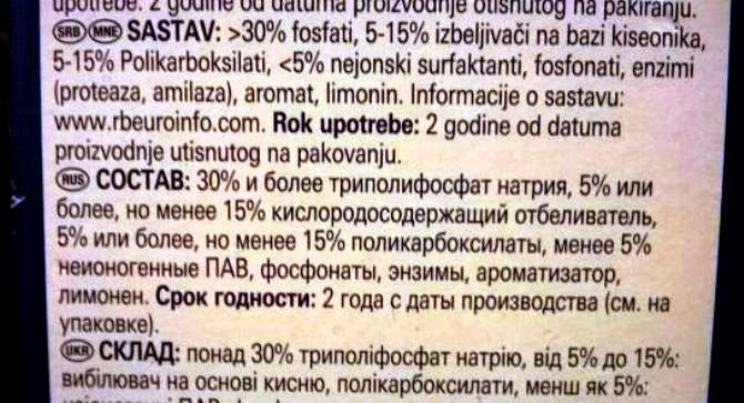 The main active ingredient is Stain Soaker, which is part of all Finish tablets. This is a patented development of the company, but in essence it is a bleach with active oxygen, which perfectly breaks down dirt and copes with traces of lipstick, tea and coffee plaque, grease film even without preliminary soaking.
