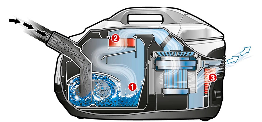 Separator water vacuum cleaners operate on the principle of a centrifuge.Polluted air enters the whirlpool, under pressure, dust particles are pressed to the bottom and are not carried out. Such a filter is very effective - it retains even mold spores.