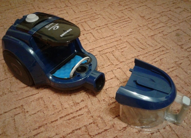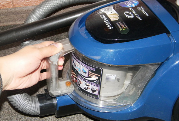 Module cyclone filter The vacuum cleaner in question has a simple design. It is removed from the main body and inserted back through a convenient handle. The filter module (container) forms part of the front area of the vacuum cleaner body design. To remove it, pull the handle with a slight movement.