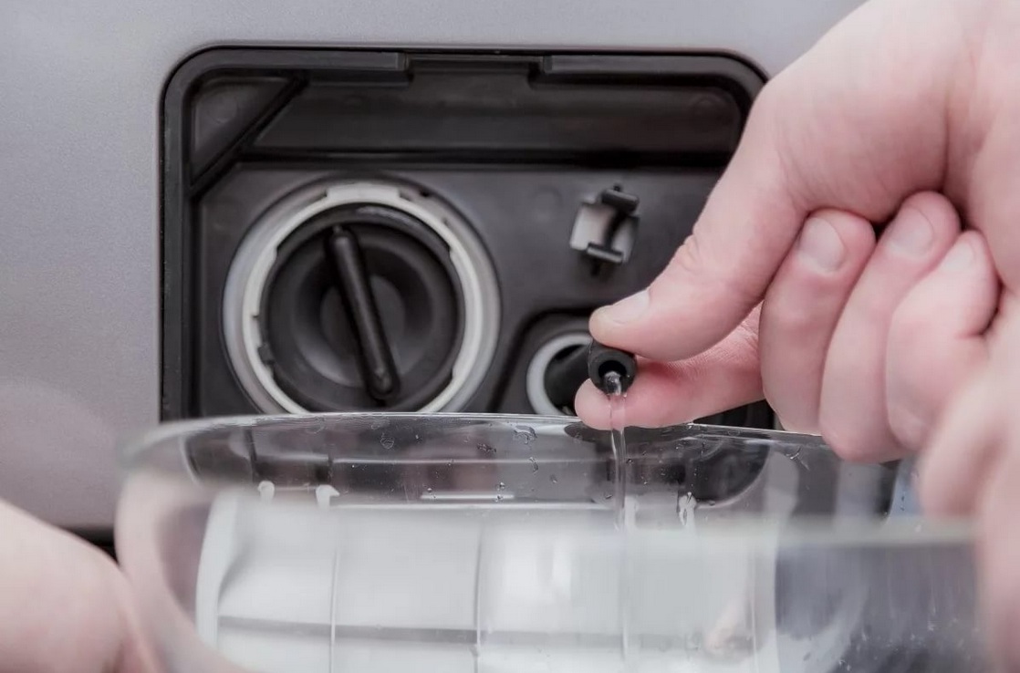 Pre-lay some soft rag or towel on the floor under the apparatus, so as not to damage the equipment. When access to the bottom of the device is obtained, it is not difficult to find a pipe. Unscrew the mount, disconnect the hose and remove the water.