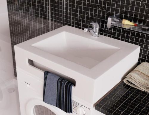 The second plus - you don’t have to bother with the selection of plumbing that is suitable in design and color, because at many points of sale of compact washers they can immediately pick up a sink that is ideally suited for it.