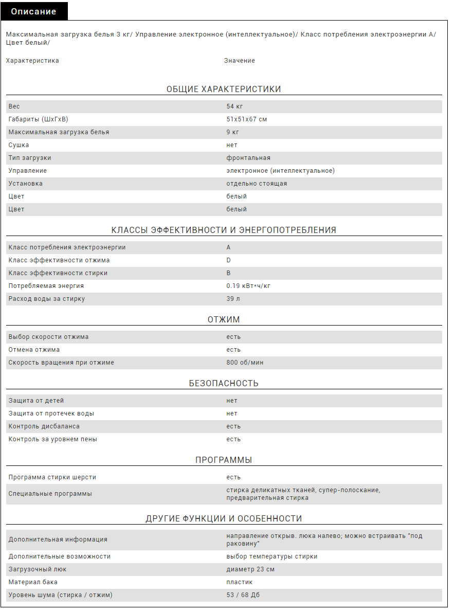Additionally, this washer has a wool wash, choice of washing temperature. Also aboutit is equipped with 4 spin modes and performs a maximum of 800 rpm., which corresponds to the average level.