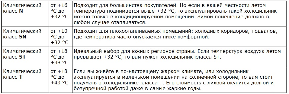 Climate class. Few people pay attention to such information in the equipment passport as the climatic class of the refrigerator. This parameter is no less important in choosing a refrigeratorthan the previous ones. It indicates what temperature for the operation of the device is optimal for high-quality conservation of products.