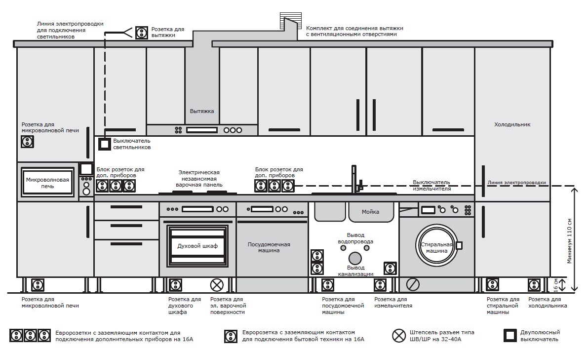 If, in addition to the refrigerator, other electrical appliances are built into the kitchen set, a group of outlets is required. In this case, choosing the cross section of the wire, you need to take into account the total power of all this kitchen equipment.