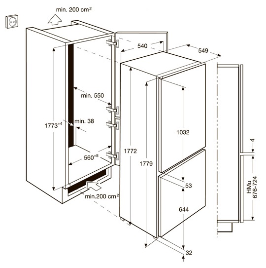 - Unobstructed air circulation between the walls of the furniture opening and the refrigerator.