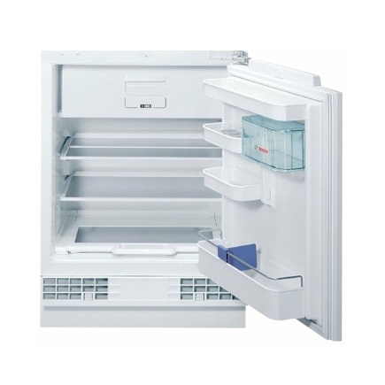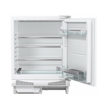 A small refrigerator is designed for integration under the countertop or built into cabinet furniture. Despite its compact dimensions, the device found a place for a freezer, a door tray for bottles, two compartments for vegetables. The main compartment has a height-adjustable glass shelf.