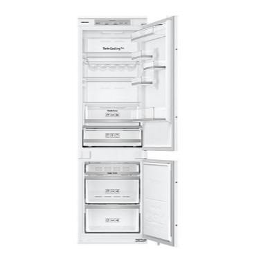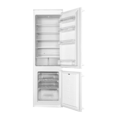 Integrated single chamber refrigerator with inverter compressor. The unit works very quietly and consumes little electricity - 106 kWh / year. For placement of products 6 adjustable shelves and 1 folding are provided. On the door there are 5 hinged trays, an egg stand. The material of the shelves is tempered glass with a plastic frame.