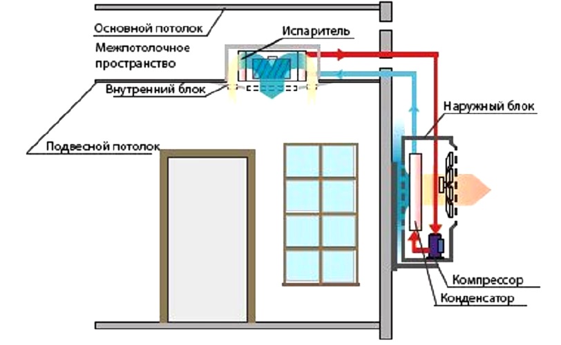 The design of the channel air conditioner completely repeats the structure of the traditional split system: one unit is mounted inside the building, the second - outside. The main difference is that the internal structures are located above the suspended ceilings, and not just fixed on the wall. There are models that can easily be placed in a closet, as well as air conditioners built into the wall.