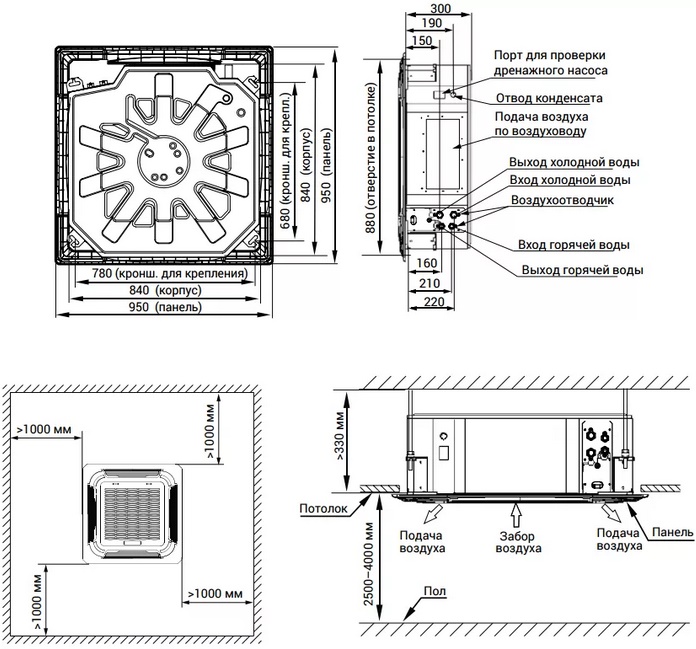 Ceiling units are the most popular and have 2 versions: cassette and channel. The first are mounted in voluminous rooms with suspended ceilings. Behind the suspended structure, a housing is arranged. The bottom panel remains visible.They can disperse air currents on two or all four sides.